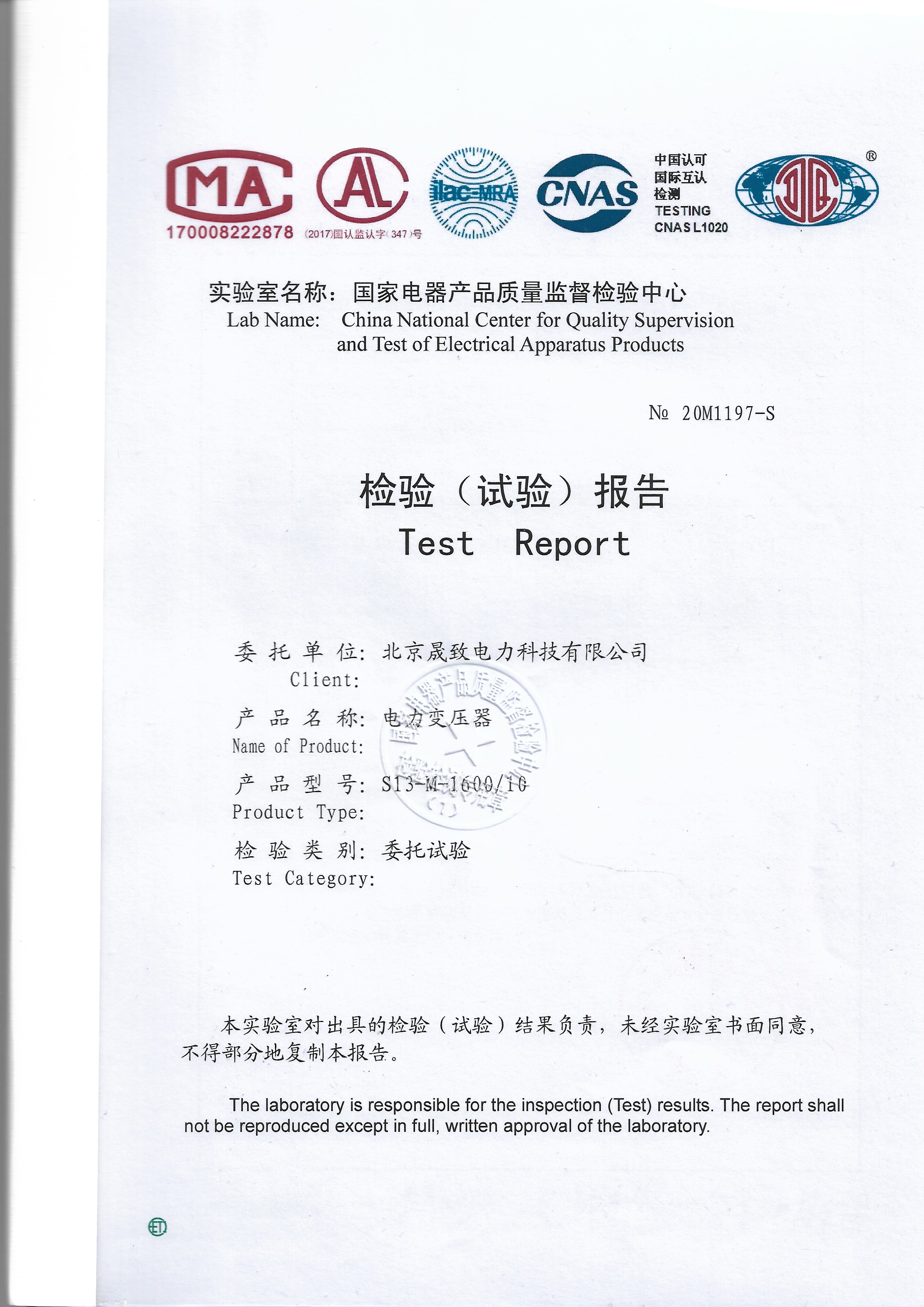 經過一系列的相關試驗后,蘇高所于2020年08月對送檢產品作出以下檢驗結論:電力變壓器(型號:S13-M-1600/10)例行試驗、型式試驗、 壓力變形試驗、三相變壓器零序阻抗測量、空載電流諧波測量的試驗結果符合檢驗依據標準和委托書要求,樣品上述試驗合格,并出具相關型式試驗報告認定。